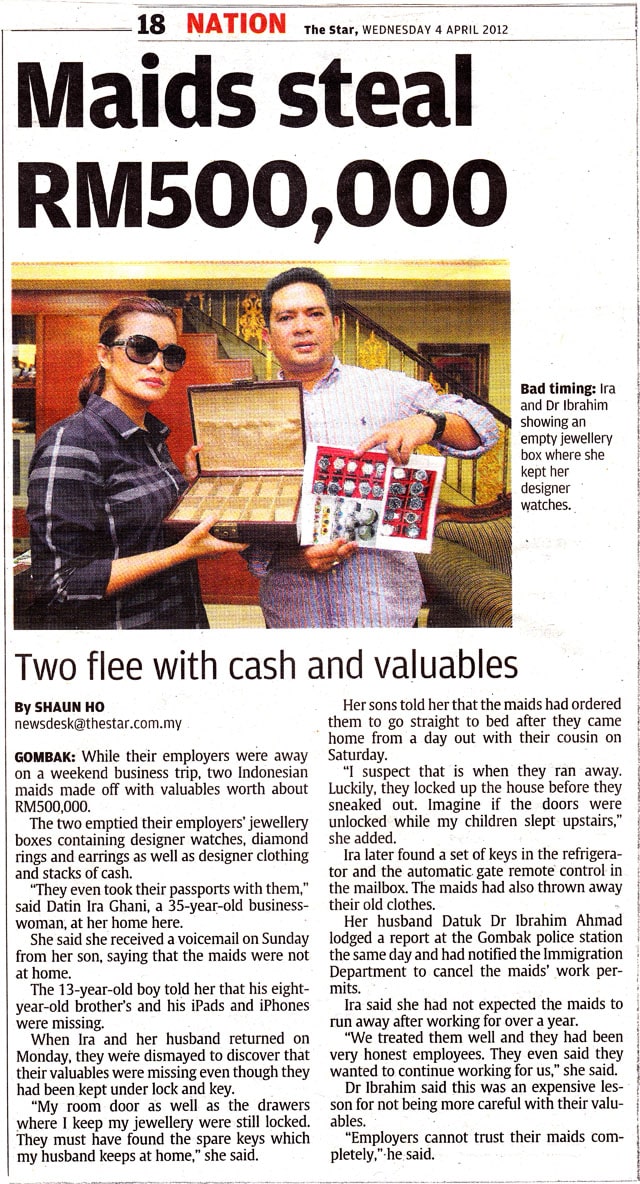 Pembantu rumah mencuri RM 500,000.00